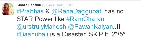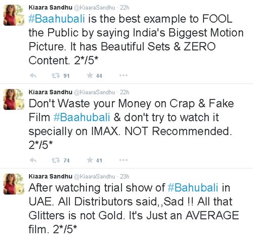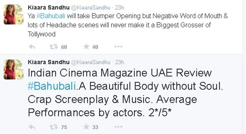 యు ఏ ఈ సెన్సార్ బోర్డు సభ్యురాలిగా ఉంటూ, ఎన్నో సినిమాలకు రివ్యూలు రాసి, నికార్సయిన ఫలితాల్ని ముందే బయటపెట్టిన కైర సంధు అనే ఓ మహిళా జర్నలిస్టు బాహుబలికి అప్పుడే రివ్యూ, రేటింగ్ రెండూ ఇచ్చేసింది. ఐదు స్టార్లకు రెండే స్టార్లు ఇచ్చిన కైరా... ఈ సినిమాని చీల్చిచండాడింది. రానా, ప్రభాస్లకు చరణ్, మహేష్, పవన్లకు ఉన్నంత స్టామినా లేదని, బాహుబలి ఇండియన్ బిగ్గెస్ట్ మోషన్ పిక్చర్ అంటూ బిల్డప్పులిచ్చారని, ఆడియన్స్కి ఫూల్స్ చేశారని, ఈ సినిమాలో కంటెంట్ లేదని, ఇది బంగారం కాదని, కేవలం రోల్డ్ గోల్డని.. తన ట్విట్టర్ ఖాతాలో చెడామడా చివాట్లు వేశారు. యు ఏ ఈలో ఈ సినిమా కొన్న బయ్యర్లు తలలు పట్టుకొన్నారని, ఈ సినిమా చూసి టైమ్, టికెట్స్ రెండూ వేస్ట్ చేసుకోవద్దని ట్విట్టారు. కాని ... ఈ విశ్లేషణలు అబద్దం కావాలని, బాహుబలి నిజంగానే ఇండియన్ రికార్డులన్నీ బద్దలుకొట్టాలని మనస్ఫూర్తిగా కోరుకొందాం. ఎందుకంటే.. మన తెలుగు సినిమా. మనమంతా గర్వించే గొప్ప సినిమా. నిజమైన తీర్పు కోసం రేపటి వరకూ ఎదురుచూద్దాం. జై.. బాహుబలి.
