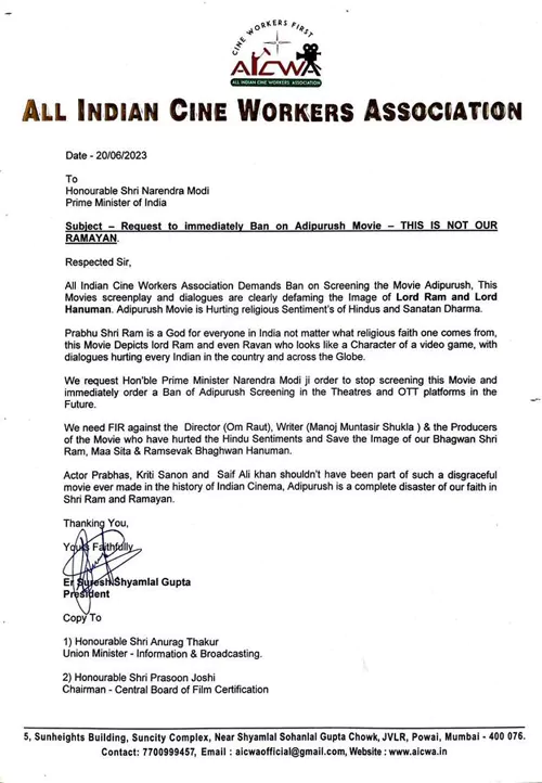 "ఆదిపురుష్ సినిమా స్క్రీన్ప్లే మరియు డైలాగ్లు శ్రీరాముడిని, హనుమంతుడిని కించపరిచేలా ఉన్నాయి. ఈ సినిమా హిందువుల మనోభావాలను దెబ్బతీసేలా ఉంది. మతాలతో సంబంధం లేకుండా భారతీయులందరికీ శ్రీరాముడు దేవుడు. రాముడు, రావణుడి పాత్రలు వీడియో గేమ్ ని తలపిస్తున్నాయి. సంభాషణలు ప్రపంచవ్యాప్తంగా ఉన్న భారతీయులందరినీ బాధపెట్టేలా ఉన్నాయి. ఈ సినిమా ప్రదర్శనను నిలిపివేయవలసిందిగా మేము గౌరవ ప్రధాన మంత్రి నరేంద్ర మోడీ గారిని అభ్యర్థిస్తున్నాము. వెంటనే థియేటర్ల నుంచి తొలగించడమే కాకుండా, భవిష్యత్తులో ఓటీటీ ప్లాట్ఫారమ్లలో కూడా స్క్రీనింగ్ జరగకుండా నిషేధించాలని కోరుతున్నాము. అలాగే ఈ చిత్ర రచయిత, దర్శకుడు, నిర్మాతలపై కేసు నమోదు చేయాలి" అని కోరుతూ ఆల్ ఇండియన్ సినీ వర్కర్స్ అసోసియేషన్ లేఖ రాసింది. మరి ఈ లేఖపై ప్రభుత్వం ఎలా స్పందిస్తుందో చూడాలి.