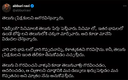 "తెలుగు ప్రేక్షకులని అగౌరవిస్తున్నారు" అంటూ తాజాగా సోషల్ మీడియా వేదికగా అబ్బూరి రవి కీలక వ్యాఖ్యలు చేశారు. "డబ్బింగ్ సినిమాలకి తెలుగు పేర్లు పెట్టేవారు. సినిమా లో, ఇతర భాషలలో ఉండే బోర్డు లని తెలుగులోకి చక్కగా మార్చేవారు. అది కూడా మానేసి విడుదల చేస్తున్నారు. వారి వారి భాష లలో వారి గొప్పదనాన్ని, కళాత్మకతని గౌరవిస్తాను. కానీ, తెలుగు ప్రేక్షకులని ఇంత తేలికగా తీసుకోవడం నచ్చట్లేదు. తెలుగుని గౌరవించని వాళ్ళని కూడా తెలుగువాళ్లు గౌరవించడం, ఆదరించడం, ఆ చిత్రాలని చూడ్డానికి మన డబ్బులు ఖర్చుపెట్టడం మన గొప్పతనం అని మాత్రం నేను అనుకోవట్లేదు." అని రాసుకొచ్చారు. ఇన్నిరోజులకు తెలుగు సినీ పరిశ్రమ నుంచి ఈ విషయంలో ఒకరు స్పందించారంటూ అబ్బూరి రవికి నెటిజన్ల నుంచి మద్దతు లభిస్తోంది.
