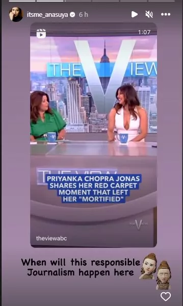 అనసూయ ఈ మధ్య తరచూ వార్తల్లో వ్యక్తిగా నిలుస్తోంది. సోషల్ మీడియాలో ఆంటీ హాష్ టాగ్ తో ట్రోల్ అవుతూ ఉంటుంది. అలా ట్రోల్ చేసేవాళ్లకు ట్విట్టర్ వేదికగా గట్టిగా వార్నింగ్ లు కూడా ఆమె ఇస్తుంది. అలాంటి అనసూయ తన ఇన్స్టాగ్రామ్ స్టేటస్ లో ఒక కామెంట్ పెట్టింది..."ఇలాంటి బాధ్యతాయుతమైన జర్నలిజం విలువలు ఇక్కడ ఎప్పుడు వస్తాయో" అని. దాని పైన ప్రియాంక చోప్రాకి జరిగిన రెడ్ కార్పెట్ ఇష్యూ ఫోటోని టాగ్ చేసింది. ఆ ఇష్యూ గురించి చెప్పుకోవాల్సి వస్తే హాలీవుడ్ ప్రాజెక్ట్ 'లవ్ అగైన్' ప్రొమోషన్స్ లో భాగంగా ప్రియాంక చోప్రా న్యూయార్క్ వెళ్లిన విషయం తెలిసిందే. అక్కడ అంతా ప్రెస్ వాళ్ళ హడావిడి ఎక్కువగా ఉంది. అలా ఆమె రెడ్ కార్పెట్ మీద నడుస్తూ ఉన్నప్పుడు ఫోటోగ్రాఫర్స్ ఆమెను ఫొటోస్ తీస్తున్నారు. ఆ టైంలో ఆమె వేసుకున్న హైహీల్స్ కారణంగా ఆమె కాలుజారి రెడ్ కార్పెట్ మీద కింద పడిపోయి చాలా ఇబ్బంది పడింది.
