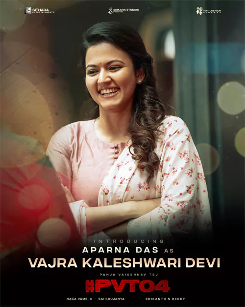 న్జన్ ప్రకాశన్, మనోహరం, బీస్ట్ వంటి సినిమాలతో మలయాళ, తమిళ సినీ పరిశ్రమల్లో తనకంటూ ప్రత్యేక గుర్తింపు తెచ్చుకున్న అపర్ణా దాస్ 'PVT04' చిత్రంతో తెలుగు సినీరంగ ప్రవేశానికి సిద్ధమైంది. ఎంతో ప్రతిభ గల ఈ నటిని తెలుగు ప్రేక్షకులకు పరిచయం చేస్తుండటం పట్ల చిత్ర బృందం ఎంతో ఉత్సాహంగా ఉంది. ప్రముఖ నిర్మాణ సంస్థ సితార ఎంటర్టైన్మెంట్స్, ఫార్చ్యూన్ ఫోర్ సినిమాస్ తో కలిసి ఈ చిత్రాన్ని నిర్మిస్తోంది. శ్రీకర స్టూడియోస్ సమర్పణలో ఎస్. నాగ వంశీ, ఎస్. సాయి సౌజన్య ఈ చిత్రాన్ని నిర్మిస్తున్నారు. పంజా వైష్ణవ్ తేజ్, శ్రీలీల, జోజు జార్జ్ ప్రధాన పాత్రలు పోషిస్తున్న ఈ చిత్రంతో శ్రీకాంత్ ఎన్ రెడ్డి దర్శకుడిగా పరిచయమవుతున్నాడు.