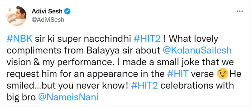 అడివి శేష్ ప్రధాన పాత్రధారిగా శైలేష్ కొలను దర్శకత్వంలో తెరకెక్కిన చిత్రం 'హిట్-2'. నాని సమర్పణలో వాల్ పోస్టర్ సినిమా బ్యానర్ పై రూపొందిన ఈ చిత్రం డిసెంబర్ 2న విడుదలై విజయవంతంగా ప్రదర్శితమవుతోంది. తాజాగా ఈ చిత్రాన్ని నందమూరి బాలకృష్ణ వీక్షించడం విశేషం.