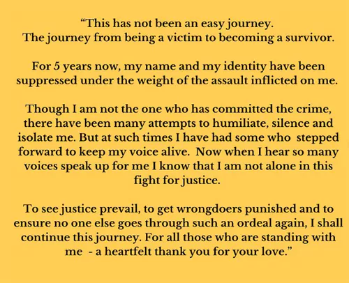 "ఇది అంత తేలికైన ప్రయాణం కాదు. బాధితురాలి నుండి ప్రాణాలతో బయటపడే వరకు సాగించిన ప్రయాణం. నాపై జరిగిన దాడితో ఐదేళ్లుగా నా పేరు, గుర్తింపుపై కూడా ప్రభావం పడుతోంది. నేరం చేసింది నేను కానప్పటికీ, నన్ను అవమానపరచడానికి, ఒంటరిని చేయడానికి చాలా ప్రయత్నాలు జరిగాయి. అలాంటి సమయంలో నాకు కొంతమంది మద్దతుగా నిలిచారు. ఇప్పుడు నా కోసం మాట్లాడే ఇన్ని గొంతులను వింటుంటే.. న్యాయం కోసం చేసే ఈ పోరాటంలో నేను ఒంటరిని కాదని తెలుస్తుంది. న్యాయం గెలవడం కోసం, ఆ దుండగుల నుంచి మరెవరికీ ఇలాంటి కష్టాలు రాకుండా ఉండటం కోసం నేను ఈ పోరాటాన్ని సాగిస్తాను. నాకు అండగా నిలుస్తున్న వారందరికీ హృదయపూర్వక ధన్యవాదాలు" అని భావన రాసుకొచ్చింది.