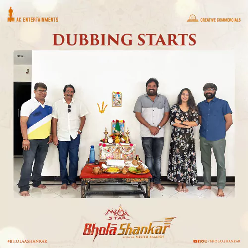 'భోళా శంకర్' డబ్బింగ్ పనులు మొదలైనట్లు తెలుపుతూ మేకర్స్ తాజాగా ఒక ఫోటోను వదిలారు. పూజా కార్యక్రమాలతో డబ్బింగ్ పనులు మొదలు పెట్టినట్టు తెలుస్తోంది. ఫొటోలో దర్శకనిర్మాతలతో పాటు నటి సురేఖ వాణి కూడా ఉన్నారు. ఈ సినిమా ఆగష్టు 11 న విడుదల కానుంది. విడుదలకు మూడు నెలల ముందే డబ్బింగ్ పనులు మొదలు పెట్టడం విశేషం.