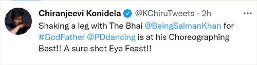 చిరంజీవి ప్రధాన పాత్రలో మోహన్ రాజా దర్శకత్వంలో రూపొందుతోన్న సినిమా 'గాడ్ ఫాదర్'. మలయాళ సూపర్ హిట్ మూవీ 'లూసిఫర్'కు రీమేక్ గా తెరకెక్కుతున్న ఈ చిత్రంలో సల్మాన్ కీలక పాత్రలో నటిస్తున్న విషయం తెలిసిందే. అయితే తాజాగా ఈ సినిమాకి సంబంధించి మెగా ఫ్యాన్స్ కి ఫుల్ కిక్ ఇచ్చే న్యూస్ షేర్ చేశారు చిరంజీవి. ఈ సినిమాలో తాను సల్మాన్ తో కలిసి డ్యాన్స్ చేస్తున్నానని, దానికి ప్రభుదేవా అద్భుతంగా కొరియోగ్రఫీ చేశాడని, కన్నుల పండుగ ఉంటుందని మెగాస్టార్ ట్వీట్ చేశారు. దీంతో మెగా ఫ్యాన్స్ ఆనందానికి అవధులు లేకుండా పోయాయి.