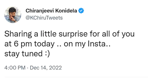 ఈరోజు సాయంత్రం 6 గంటలకు మీ అందరితో ఒక సర్ ప్రైజ్ షేర్ చేసుకుంటాను అంటూ కాసేపటి క్రితం మెగాస్టార్ చిరంజీవి ట్వీట్ చేశారు. దీంతో ఆయన చెప్పబోయే సర్ ప్రైజ్ ఏమై ఉంటుందా అని అభిమానులు ఎంతో ఆసక్తిగా ఎదురుచూస్తున్నారు.