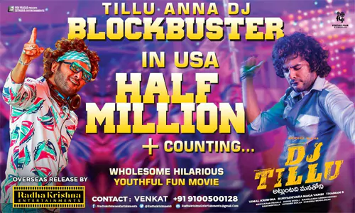 ఓవర్సీస్ లోనూ 'డీజే టిల్లు' మంచి కలెక్షన్స్ రాబడుతోంది. డీజే టిల్లు యూఎస్ లో హాఫ్ మిలియన్ మార్క్ దాటిందని తెలుపుతూ ఈ సినిమాని ఓవర్సీస్ లో రిలీజ్ చేసిన రాధా కృష్ణ ఎంటర్టైన్మెంట్స్ తాజాగా ప్రకటించింది. ఈ మేరకు నిర్మాత నాగ వంశీకి, మూవీ టీమ్ కి రాధా కృష్ణ ఎంటర్టైన్మెంట్స్ సంస్థ ధన్యవాదాలు తెలిపింది. 'డీజే టిల్లు' ముందు ముందు ఎలాంటి సంచలనాలు సృష్టిస్తుందో చూడాలి.