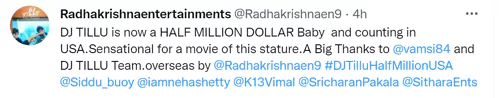 యూఎస్ లో హాఫ్ మిలియన్ మార్క్ దాటిన 'డీజే టిల్లు'
