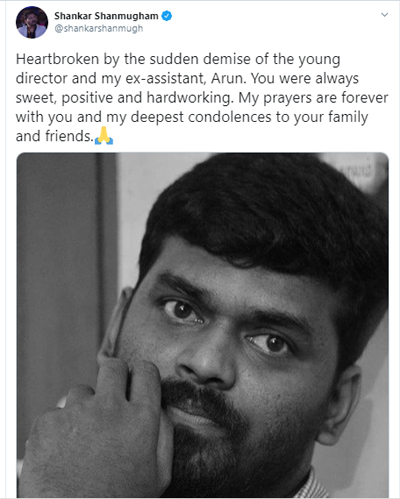 ఆయన దగ్గర గతంలో అసిస్టెంట్ దర్శకుడిగా పని చేసిన అరుణ్ మృతి చెందారు. అతడి మరణవార్త విని గుండె పగిలిందని శంకర్ ట్వీట్ చేశారు. స్వీట్, పాజిటివ్, హార్డ్ వర్కింగ్ పర్సన్ అని ఆయన కొనియాడారు. శంకర్ దగ్గర కొన్ని సినిమాలకు పని చేశాక అతడు డైరెక్టర్ అయ్యాడు. జీవీ ప్రకాష్ హీరోగా ‘4 జి’ సినిమా తీశాడు. రోడ్డు ప్రమాదంలో అరుణ్ మృతి చెందినట్టు కొందరు చెబుతున్నారు. బుల్లెట్ కిందపడిన ఫొటోలు ట్వీట్ చేస్తున్నారు.