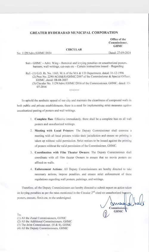 కానీ ఇప్పుడు అనుబంధం తెగిపోనుంది. గ్రేటర్ హైదరాబాద్ పరిధిలో ఎక్కడ కూడా సినిమా వాల్ పోస్టర్స్(cinema poster)అంటించకూడదని గ్రేటర్ హైదరాబాద్ మున్సిపల్ కార్పొరేషన్(ghmc)కమిషనర్ నుంచి ఉత్తర్వులు జారీ అయ్యాయి.ఒక వేళ నిబంధనలని అతిక్రమించి ఎవరైనా పోస్టర్ అంటిస్తే సంబంధిత ప్రింట్ ఎవరైతే తీశారో వాళ్ళకి పెనాల్టీ వేస్తారు.అంటే ఆ చిత్ర నిర్మాతకి పెనాల్టీ విధించడం జరుగుతుంది.