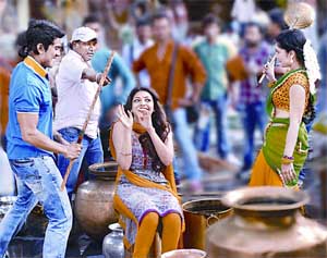 Check out the latest picture of Kamalinee Mukherjee who is acting opposite Srikanth in the Krishna Vamsi film Govindudu Andarivadele which stars Ram Charan and Kajol in the lead . This Bengali Bombshell who literally disappeared from the TFI is now seen as curvaceous Village Belle in this picture. Still beautiful and slim it’s a pity she has been relegated to a second heroine status in the films nowadays.