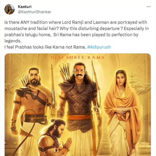 'ఆదిపురుష్' చిత్రంలో ప్రభాస్ ని చూస్తుంటే రాముడిలా కనిపించడం లేదని, కర్ణుడిలా కనిపిస్తున్నాడని నటి కస్తూరి సంచలన వ్యాఖ్యలు చేసింది. ఆమె వ్యాఖ్యలపై భిన్నాభిప్రాయాలు వ్యక్తమవుతున్నాయి. కొందరు ఆమె వ్యాఖ్యలతో ఏకీభవిస్తుండగా, ప్రభాస్ అభిమానులు మాత్రం ఆమెపై మండిపడుతున్నారు.