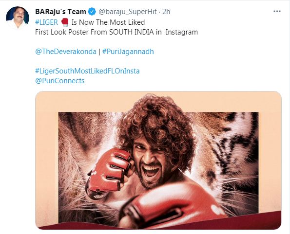 సౌత్ ఇండియాలోనే సోషల్ మీడియాలో అత్యధిక లైక్ లు పొందిన ఫస్ట్లుక్ పోస్టర్ గా లైగర్ నిలిచింది. ఈ ఫస్ట్ లుక్ పోస్టర్ ఇన్ స్టాగ్రామ్లో 2 మిలియన్లకు పైగా లైక్స్ సాధించి రికార్డు సృష్టించింది. విజయ్-పూరీ కాంబోలో వస్తున్న మూవీ ఫస్ట్ లుక్ పోస్టర్ కే ఈ రేంజ్ రెస్పాన్స్ వస్తే.. ముందు ముందు ఈ సినిమా ఎలాంటి సంచలనాలు సృష్టిస్తుందో చెప్పాలి.