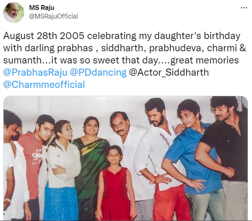 ప్రముఖ నిర్మాత, దర్శకుడు ఎం.ఎస్.రాజు తాజాగా ట్విట్టర్ లో 17 ఏళ్ళ క్రితం నాటి ఒక ఫోటోను షేర్ చేశారు. అందులో ప్రభాస్, సిద్ధార్థ్, ప్రభుదేవా ముగ్గురూ ఒకే తరహా ఫోజులో నిల్చొని ఉండగా.. వాళ్ళని చూసి ఛార్మి నవ్వుతూ కనిపించింది.