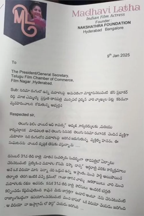 రెండు వారాల క్రితం తాడిపత్రి మున్సిపల్ కమిషన్ చైర్మన్,మాజీ ఏంఎల్ఏ జెసిప్రభాకర్ రెడ్డి ఏర్పాటు చేసిన నూతన సంవత్సరం వేడుకల్ని ఉద్దేశించి మాధవిలత సోషల్ మీడియా వేదికగా కొన్ని ఆరోపణలు చేయడం,వాటికి కౌంటర్ ఇచ్చే సమయంలో మాధవీలతపై జేసీ ప్రభాకర్ రెడ్డి అనుచిత వ్యాఖ్యలు చేయడం తెలిసిందే.ఆ తర్వాత జేసీ ప్రభాకర్ రెడ్డి తన మాటలకి క్షమాపణలు చెప్పాడు.కానీ ఇప్పడు జెసి ప్రభాకర్ రెడ్డి పై మాధవిలత మూవీ ఆర్టిస్ట్ అసోసియేషన్( మా) లో ఫిర్యాదు చేసింది.ఈ సందర్భంగా మీడియాతో మాట్లాడుతూ నేను సోషల్ ఎవర్నేస్ కోసమే ఆ వీడియో చేశాను.ఆయన సారీ చెప్పినప్పుడు కూడా నేను సినిమా అమ్మాయిని అని చులకనగా మాట్లాడాడు. ఈ విషయంలో నేను హ్యూమన్ కమిషన్ ని కూడా కలిసాను. కేసు నంబర్స్ కూడావాళ్ళు ఇచ్చారు.సినిమా వాళ్లంటే ఆయనకి అంత చులకన ఎందుకు.నాపై చేసిన ఆరోపణల మీద న్యాయ పరంగా పోరాడతానని చెప్పుకొచ్చింది.