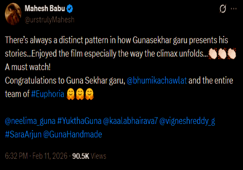 He wrote on X, "There’s always a distinct pattern in how Gunasekhar garu presents his stories…Enjoyed the film especially the way the climax unfolds… A must watch! Congratulations to Guna Sekhar garu, @bhumikachawlat and the entire team of #Euphoria." Bhumika Chawla earned good name for her performance.