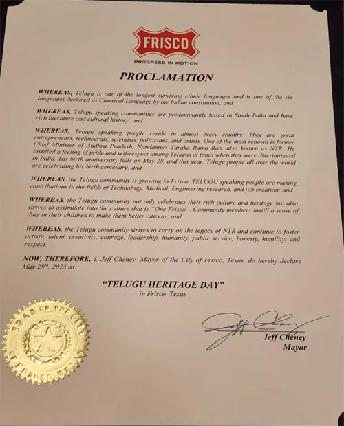 తెలుగు ప్రజలందరూ అన్నగారిగా భావించి గౌరవించే శ్రీ నందమూరి తారకరామారావు పుట్టిన మే 28వ తేదీని ప్రిస్కో నగర తెలుగు హెరిటేజ్ డే గా ఆ నగర మేయర్ జెఫ్ చేనీ ప్రకటించారు. ఈ మేరకు ఒక ప్రెస్ నోట్ కూడా విడుదల చేశారు. ఎన్టీఆర్ స్ఫూర్తితో తెలుగు ప్రజలందరూ ముందుకు వెళుతున్నారని, ఆయన శతజయంతి ఉత్సవాలను అత్యంత ఘనంగా జరుపుకుంటున్న నేపథ్యంలో తమ తరఫున ఆయనకు గౌరవార్థంగా ఈ మేరకు నిర్ణయం తీసుకున్నట్లుగా ప్రెస్ నోట్లో పేర్కొన్నారు.