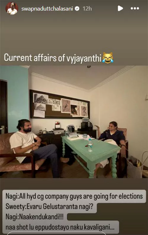 అలా తన ఇనిస్టాగ్రమ్ స్టోరీలో ఉంచిందో లేదో విత్ ఇన్ సెకన్లలో వైరల్ గా మారింది. సీజీ వర్క్ చేస్తున్న వాళ్లంతా హైదరాబాద్ నుంచి ఎలెక్షన్స్ కి వెళ్లిపోయారని నాగీ అంటాడు. దాంతో ఎన్నికల్లో ఎవరు గెలుస్తారని స్వప్న అంటుంది .ఎవరు గెలిస్తే నాకెందుకండి నా షాట్స్ ఎప్పుడు వస్తాయో నాకు కావాలి అంటూ నాగీ బదులిచ్చాడు. ఇప్పుడు ఈ ఫన్నీవీడియోనే సోషల్ మీడియాని ఒక ఊపు ఊపుతుంది. ఇక ప్రభాస్ ఫ్యాన్స్ గురించి అయితే చెప్పుకోవాల్సిన పని లేదు. తమ దైన స్టైల్లో కామెంట్స్ చేస్తున్నారు, కాకపోతే ఆ వీడియో గురించి తెలిసిన విషయం ఏంటంటే కల్కి గ్రాఫిక్స్ పనులు ఇంకా కొనసాగుతూనే ఉన్నాయని