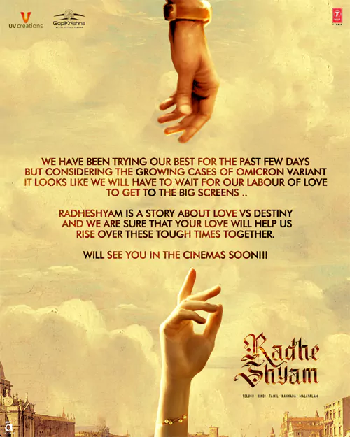 'ఆర్ఆర్ఆర్' వాయిదా ప్రకటన వచ్చిన సమయంలోనే రాధేశ్యామ్ కూడా వాయిదా పడుతుందన్న అభిప్రాయాలు వ్యక్తమయ్యాయి. మూవీ టీమ్ మాత్రం జనవరి 14 నే విడుదల చేస్తామని చెప్పుకొచ్చింది. అయితే రోజురోజుకి పరిస్థితి చేయి దాటి పోతుండటంతో.. తప్పనిసరి పరిస్థితుల్లో రాధేశ్యామ్ ని వాయిదా వేస్తున్నట్లు తాజాగా మేకర్స్ ప్రకటించారు. ఒమిక్రాన్ వేరియంట్ కేసులు పెరుగుతున్న కారణంగా మూవీ విడుదలని వాయిదా వేస్తున్నామని, పరిస్థితులు చక్కబడ్డాక వీలైనంత త్వరలో థియేటర్స్ లో కలుద్దామని నిర్మాణ సంస్థ యూవీ క్రియేషన్స్ సోషల్ మీడియా ద్వారా తెలిపింది.