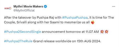 'పుష్ప-2' రెండో సాంగ్ అనౌన్స్ మెంట్ రేపు(మే 23) ఉదయం 11:07 కి రాబోతున్నట్లు మేకర్స్ ప్రకటించారు. " పుష్ప పుష్ప అంటూ పుష్పరాజ్ అలరించాడు. ఇప్పుడు తన సామితో కలిసి శ్రీవల్లి మెస్మరైజ్ చేసే సమయం వచ్చింది." అంటూ మేకర్స్ సెకండ్ సింగిల్ అప్డేట్ ఇచ్చారు. ఈ సాంగ్ మే 30న విడుదల కానుందని సమాచారం.