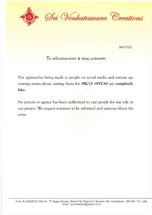 మెగా పవర్ స్టార్ రామ్ చరణ్ సినిమాలో నటించే అవకాశం అంటూ సోషల్ మీడియాలో పోస్ట్ లు చూశారా. ఎలాగైనా రామ్ చరణ్ సినిమాలో నటించే ఛాన్స్ దక్కించుకోవాలని ఎంతో ఆశగా ఎదురు చూస్తున్నారా?. అలాంటి పోస్ట్ లు చూసి ఆవేశపడి, మోసపోకండి. అదంతా తప్పుడు ప్రచారమంటూ తాజాగా శ్రీ వెంకటేశ్వర క్రియేషన్స్ క్లారిటీ ఇచ్చింది.