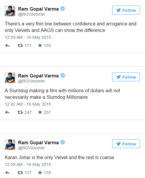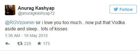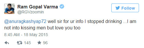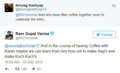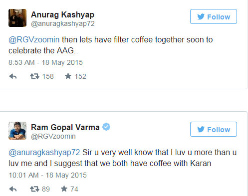 We cant find anyother director on Indian film Industry who is more unique and sarcastic than RGV , Let it be Bollywood , Tollywood or Kollywood wait wait even Hollywood also ... Ok jokes apart yesterday RGV pulled the legs of Bombay Velvet director Anurag Kashyap on twitter he crossed his swords with Anurag Kashyap and had a tweet war with him and if you want to know who won this war check this series of tweets