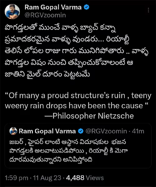 చిరంజీవి నటించిన తాజా చిత్రం 'భోళా శంకర్' నేడు(ఆగస్టు 11) ప్రేక్షకుల ముందుకొచ్చింది. మొదటి షో నుంచే ఈ సినిమా నెగటివ్ టాక్ ని సొంతం చేసుకుంది. అభిమానులు సైతం ఈ సినిమా పట్ల నిరాశ వ్యక్తం చేస్తున్నారు. దీంతో ఇదే సరైన సమయమని భావించాడో ఏమో గానీ.. సూచనతో కూడిన సెటైర్ లాంటి ట్వీట్స్ చేశాడు ఆర్జీవీ. "జబర్, హైపర్ లాంటి ఆస్థాన విదూషకుల భజన పొగడ్తలకి అలవాటుపడిపోయి, రియాల్టీ కి మెగా దూరమవుతున్నారని అనిపిస్తోంది. పొగడ్తలతో ముంచే వాళ్ళ బ్యాచ్ కన్నా ప్రమాదకరమైన వాళ్ళు వుండరు... రియాల్టీ తెలిసే లోపల రాజు గారు మునిగిపోతారు. వాళ్ళ పొగడ్తల విషం నుంచి తప్పించుకోవాలంటే ఆ జాతిని మైల్ దూరం పెట్టటమే" అని ఆర్జీవీ ట్వీట్స్ చేశాడు.ప్రస్తుతం ఈ ట్వీట్స్ వైరల్ గా మారాయి.