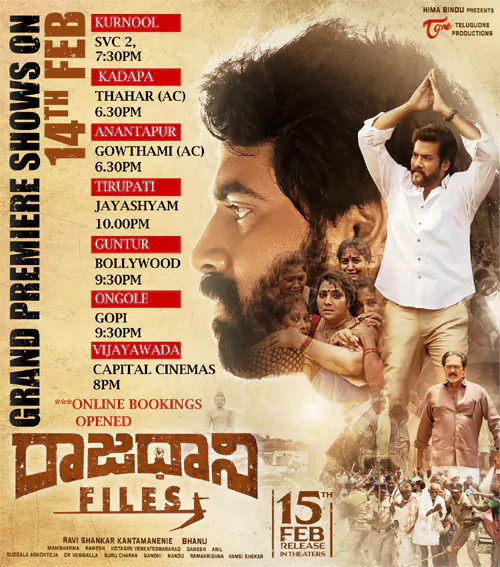 రాజధాని ఫైల్స్ ఈ రోజు ప్రపంచ వ్యాప్తంగా ప్రీమియర్ షో లతో థియేటర్స్ లో ఒక నవ శకానికి నాంది పలకబోతుంది. కర్నూల్ ఎస్ విసి థియేటర్ స్క్రీన్ 2 లో 7 :30 pm కి కడప తహార్ లో 6 :30 pm కి అనంతపురం గౌతమీ 6 :30 pm తిరుపతి జయశ్యాం 6 :30 గుంటూరు బాలీవుడ్ 9 :30 , ఒంగోలు గోపి 9 :30 , విజయవాడ క్యాప్టిల్ సినిమా 8 pm ఇలా అన్ని చోట్ల ప్రీమియర్ షోస్ తో రాజధాని ఫైల్స్ తన సత్తా చాటనుంది.