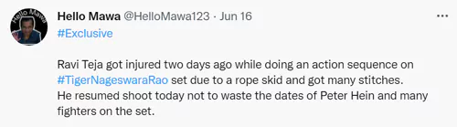 మాస్ మహారాజా రవితేజ ప్రస్తుతం పలు క్రేజీ ప్రాజెక్ట్స్ తో బిజీగా ఉన్నాడు. అందులో 'టైగర్ నాగేశ్వరరావు' ఒకటి. స్టువర్టుపురం దొంగ టైగర్ నాగేశ్వరరావు జీవితం ఆధారంగా ఈ రూపొందిస్తున్న ఈ సినిమాకి వంశీ కృష్ణ దర్శకుడు. ప్రస్తుతం ఈ మూవీ షూటింగ్ జరుగుతోంది. అయితే తాజాగా షూట్ లో తాజాగా రవితేజ గాయపడినట్లు తెలుస్తోంది.