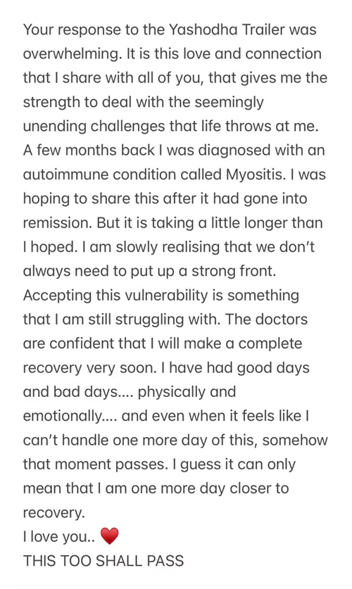 హీరోయిన్ సమంత అనారోగ్యంతో బాధపడుతున్నట్లు కొద్దిరోజుల క్రితం వార్తలొచ్చిన సంగతి తెలిసిందే. అయితే ఆ వార్తలు నిజమేనని చెప్పి తాజాగా షాక్ ఇచ్చింది సమంత. తాను ఒక అరుదైన అనారోగ్య సమస్యతో బాధపడుతున్నానని, కోలుకోవడానికి సమయం పడుతుందని చెప్పింది.