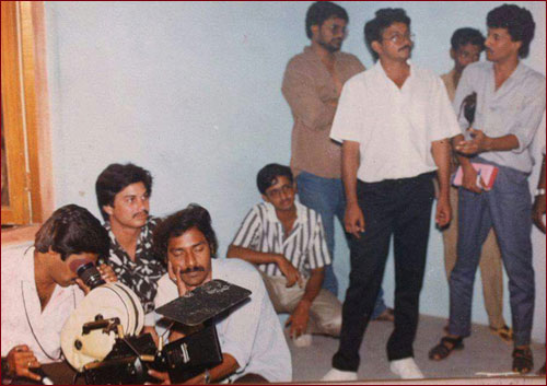 Cameramen Gopal Reddy and Rasool were busy setting a block for next shot. Can you guess the person sat on the floor? It’s director Teja who worked in camera department before venturing into direction with Chitram.