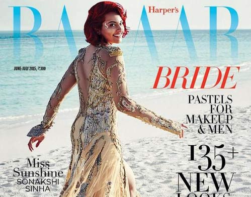 For the coming edition of Harper’s Bazaar Bride cover-page, Bollywood’s bombshell Sonakshi posed quite seductively. As she walks the sand in a golden gown like dress, her metallic embroidered jacket and lehenga are glittering like gold while Sona’s skin dazzles more than that. Posing like a bride, she’s making her traverse into their dreams imagining themselves as a bridegroom.