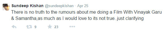 From past few days many media channels and websites (except ours wink ) were saying that Sundeep Kishan is all set to break the star league under the direction of VV Vinayak and Samantha will be seen as a female lead . Almost T-town is filled with this rumors and today so yesterday Sundeep Kishan on his official twitter handle clarified that he is not doing any film with VV Vinayak and Samantha and he also said that the news which came out is a big rumour