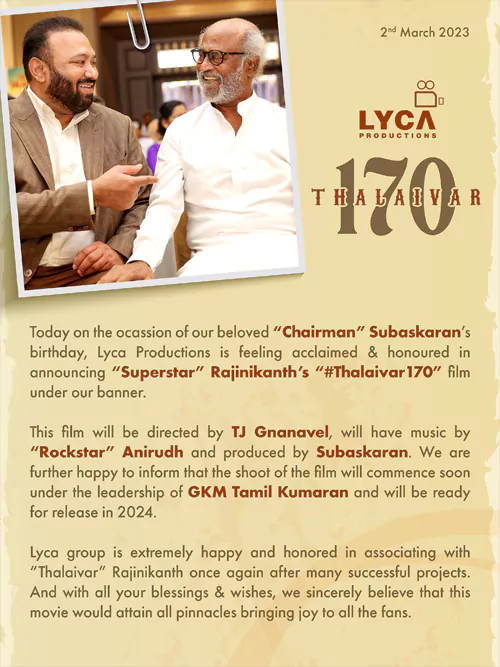 లైకా ప్రొడక్షన్స్ చైర్మన్ శుభాస్కరన్ పుట్టినరోజు సందర్భంగా రజినీకాంత్ 170వ సినిమాని అధికారికంగా ప్రకటించారు. అనిరుధ్ ఈ చిత్రానికి సంగీతం అందించనున్నాడు. త్వరలోనే ఈ మూవీ షూటింగ్ ప్రారంభించి, వచ్చే ఏడాది విడుదల చేయడానికి సన్నాహాలు చేస్తున్నారు. ఇప్పటికే 'పొన్నియిన్ సెల్వన్-2', 'ఇండియన్-2' వంటి పలు భారీ చిత్రాలను నిర్మిస్తున్న లైకా ఇప్పుడు రజినీతో మరో భారీ చిత్రాన్ని ప్రకటించింది. గతంలో సూపర్ స్టార్ తో 'రోబో 2.O', 'దర్బార్' వంటి చిత్రాలను నిర్మించింది. అలాగే ఐశ్వర్య రజినీకాంత్ దర్శకత్వంలో లైకా నిర్మిస్తున్న 'లాల్ సలాం' చిత్రంలో రజినీకాంత్ కీలక పాత్రలో నటిస్తున్నారు. ఇప్పుడు మరోసారి లైకాతో చేతులు కలిపారు రజినీ.