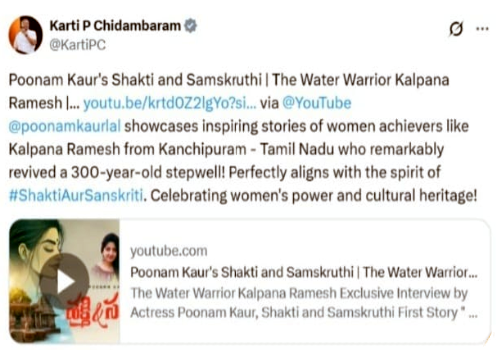 He wrote, "Poonam Kaur's Shakti and Samskruthi, The Water Warrior Kalpana Ramesh (episode) showcases inspiring stories of women achievers like Kalpana Ramesh from Kanchipuram - Tamil Nadu who remarkably revived a 300-year-old stepwell! Perfectly aligns with the spirit of #ShaktiAurSanskriti. Celebrating women's power and cultural heritage!"
