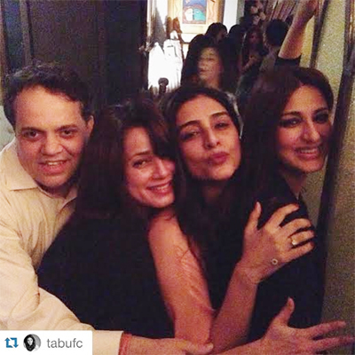 Yesteryear actresses Sonali Bendre and Tabu have been seen partying with friends recently. The two heroines once ruled the box office in telugu and hindi cinema and were seen together in the Hindi movie "Hum Saath Saath Hain". Here is a picture of them together.
