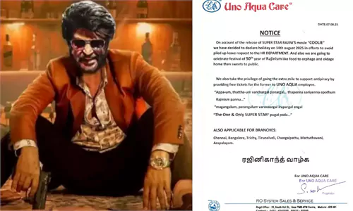 కూలీ రిలీజ్ సందర్భంగా తమిళనాడు(Tamilanadu)లో కొన్ని సంస్థలు తమ ఉద్యోగులకి సెలవలు ప్రకటించాయి. 'యూనో ఆక్వా కేర్'(Uno Aqua Care)అనే సంస్థ ఇంకో అడుగు ముందుకేసి తమ ఉద్యోగులకు సెలవు ఇవ్వడంతో పాటు ఉచితంగా 'కూలీ' టికెట్స్ ని కూడా అందించింది. చెన్నై తో పాటు బెంగుళూరు, తిరుచ్చి, తిరునల్వేలి, చెంగల్పట్టు, మాట్టుత్తావణి, ఆరప్పాళెయం బ్రాంచ్ల్లో ఉన్న ఉద్యోగులకు ఈ ఆఫర్ ఇచ్చింది. ఇప్పుడు ఈ న్యూస్ సోషల్ మీడియాలో వైరల్ గా మారింది.