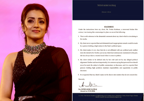 The statement clarifies that Trisha has no affiliation with any political party and intends to maintain her long-standing neutral stance in politics. It emphasizes that she wishes to be recognized solely for her craft as an actress rather than being linked to any political discourse. The communique further notes that personal lives should not be made a subject of public commentary, especially by those holding responsible positions in the state's political space.