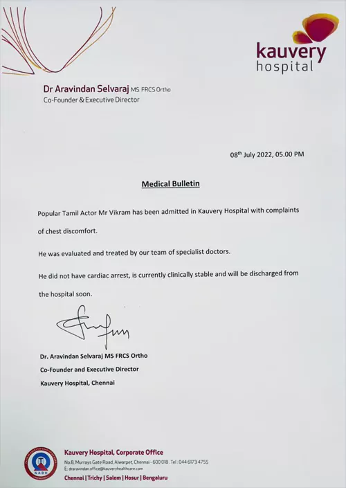 కావేరి హాస్పిటల్ విడుదల చేసిన హెల్త్ బులిటెన్ తో విక్రమ్ అభిమానుల్లో ఆందోళన తొలిగిపోయినట్లే అని చెప్పొచ్చు.