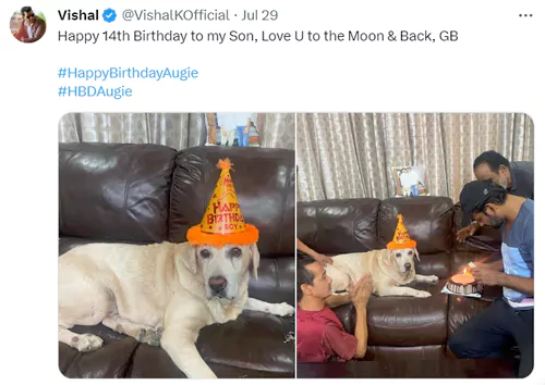 విశాల్ కొడుకు పేరు ఆగీ. ఈ 14 ఏళ్ల కొడుకు పుట్టినరోజు వేడుకలను అమ్మానాన్నల సమక్షంలో ఇష్టంగా కేక్ కట్ చేసి నిర్వహించుకున్నారు విశాల్. విశాల్కి పెళ్లి ఎప్పుడు అయింది? కొడుకు ఎప్పుడు పుట్టాడు? అని అనుమానిస్తున్నారా? ఆగి విశాల్ పెట్ డాగ్ పేరు. ఆగి పుట్టినరోజునే గ్రాండ్గా నిర్వహించారు విశాల్.