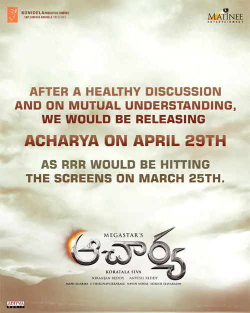 చిరంజీవి హీరోగా కొరటాల శివ దర్శకత్వంలో తెరకెక్కిన సినిమా 'ఆచార్య'. రామ్ చరణ్ కీలక పాత్ర పోషిస్తున్న ఈ సినిమా ఫిబ్రవరిలో విడుదల కావాల్సి ఉండగా కరోనా థర్డ్ వేవ్ కారణంగా ఏప్రిల్ 1 కి వాయిదా పడింది. అయితే ఇప్పుడు ఆర్ఆర్ఆర్ ఎఫెక్ట్ తో మరోసారి ఆచార్య విడుదల తేదీ మారింది. ఆర్ఆర్ఆర్ మార్చి 25 న విడుదలవుతున్న నేపథ్యంలో మ్యూచువల్ అండర్ స్టాండింగ్ తో తమ సినిమాని ఏప్రిల్ 29 కి వాయిదా వేసినట్లు తాజాగా ఆచార్య టీమ్ ప్రకటించింది.