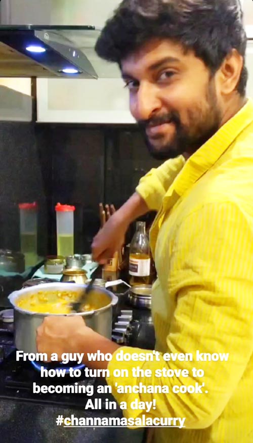 కరోనా కారణంగా సినిమా ఇండస్ట్రీ షట్ డౌన్ అయింది. షూటింగుల్లేవ్. సరదాగా షికార్లు చేయడానికి పర్మిషన్లు లేవ్. కంట్రీ అంతా లాక్ డౌన్ కదా! అందుకని, అందరూ ఇంటి నుండి బయట అడుగుపెట్టడం లేదు. మొదట్లో ఇంటి దగ్గర పక్షుల కిలకిలలు ఎంజాయ్ చేసిన నాని, రీసెంట్గా వంట చేశాడు. "కనీసం స్టవ్ ఎలా ఆన్ చేయాలో కూడా తెలియని వ్యక్తి.. కుక్ కింద మారాడు. అదీ ఒక్క రోజులో. చనా మసాలా వండాడు" అని నాని వైఫ్ ఇన్స్టాగ్రామ్లో షేర్ చేశారు. నాని 25వ సినిమా 'వి' విడుదలకు సిద్ధంగా ఉంది. ఇందులో తొలిసారి విలన్గా అతను కనిపించబోతున్నాడు.