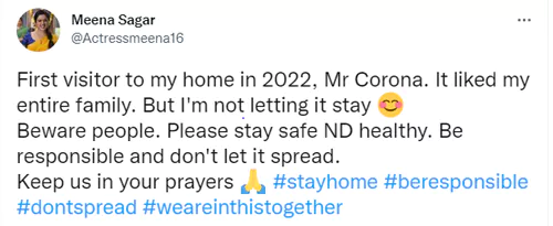 తనతో పాటు తన కుటుంబానికి కరోనా సోకిందని తెలుపుతూ తాజాగా మీనా సోషల్ మీడియాలో పోస్ట్ పెట్టారు. ఈ ఏడాది మా ఇంటికొచ్చిన మొదటి అతిథి కరోనా అంటూ ఈ విషయాన్ని ఆమె ఎంతో సరదాగా చెప్పారు. "2022లో మా ఇంటికి వచ్చిన మొదటి అతిథి మిస్టర్ కరోనా. అది మా కుటుంబం మొత్తాన్ని ఇష్టపడింది. కానీ, దానికి నేను మా ఇంట్లో చోటు ఇవ్వను. మీరంతా జాగ్రత్తగా ఉండి, మీ ఆరోగ్యాన్ని కాపాడుకోండి. కరోనా వ్యాప్తికి అవకాశం ఇవ్వకండి.బాధ్యతగా ఉండండి" అంటూ మీనా ట్వీట్ చేశారు. కరోనా నుంచి మీనా కుటుంబం త్వరగా కోలుకోవాలని కోరుకుంటూ నెటిజన్లు ఆమె ట్వీట్ కి రిప్లై ఇస్తున్నారు.