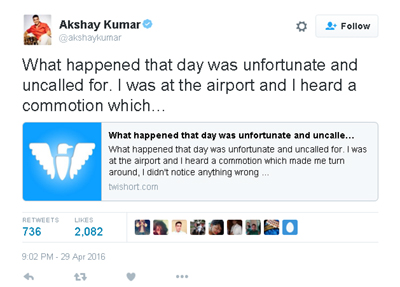 ఇంటికి వెళ్లిన తర్వాత ఈ విషయం తెలుసుకున్న అక్షయ్, ట్విట్టర్ వేదికగా ఆ అభిమానికి క్షమాపణ చెప్పాడు. బాడీగార్డ్ చేయిచేసుకోవడం తాను చూడలేదని, విషయం తెలిసిన తర్వాత అతన్ని హెచ్చరించానని, జరిగిన దానికి బాధ్యత వహిస్తూ క్షమాపణ కోరుతున్నానని అక్షయ్ అన్నారు. నిజానికి ఇంటికెళ్లిపోయిన తర్వాత, దీనిపై స్పందించాల్సిన అవసరం అక్షయ్ కు లేదు. కానీ విషయం తెలుసుకుని, పబ్లిగ్గా సారీ చెప్పడం ఒక్క అక్షయ్ కే చెల్లిందని బాలీవుడ్ పొగడ్తలు కురిపిస్తోంది. కాగా, అక్షయ్ రజనీ రోబో 2.0 లో విలన్ గా నటిస్తున్న సంగతి తెలిసిందే.