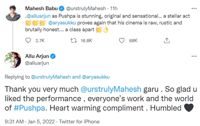 "థాంక్యూ వెరీ మచ్ మహేశ్బాబు గారూ.. పర్ఫార్మెన్స్ను, అందరి పనితనాన్నీ, 'పుష్ప' ప్రపంచాన్ని ఇష్టపడినందుకు చాలా ఆనందంగా ఉంది. హృదయాన్ని స్పృశించే కాంప్లిమెంట్. హంబుల్డ్" అని రిప్లై ఇచ్చిన బన్నీ దానికి బ్లాక్ హార్ట్ ఎమోజీని జోడించాడు.
