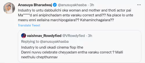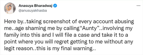ట్విట్టర్ వేదికగా కొందరు అనసూయను దారుణంగా ట్రోల్ చేస్తూ.. 'ఆంటీ' అనే హ్యాష్ ట్యాగ్ ని ట్రెండ్ చేస్తున్నారు. ఇంకా కొందరైతే ఆమెని వ్యక్తిగతంగా టార్గెట్ చేస్తూ దారుణ వ్యాఖ్యలు చేస్తున్నారు. దీంతో తనను ట్రోల్ చేసేవాళ్ళని జైల్లో పెట్టిస్తానంటూ అనసూయ ట్విట్టర్ వేదికగా వార్నింగ్ ఇచ్చింది. తన గురించి తప్పుగా చేసిన ప్రతి ట్వీట్ ని స్క్రీన్ షాట్ తీసి.. పోలీస్ కేసు ఫైల్ చేస్తానని హెచ్చరించింది.