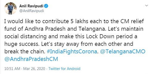కరోనా మహమ్మారిపై పోరాటానికి తెలుగు చిత్రసీమ నుంచి మద్దతు పెరుగుతోంది. తాజాగా 'సరిలేరు నీకెవ్వరు' డైరెక్టర్ అనిల్ రావిపూడి కరోనా వైరస్ వ్యాప్తిని అరికట్టడానికి రెండు తెలుగు రాష్ట్రాలకు తన వంతుగా మొత్తం రూ. 10 లక్షలు విరాళం ప్రకటించారు. తెలంగాణ, ఆంధ్రప్రదేశ్ ముఖ్యమంత్రి సహాయ నిధులకు చెరో రూ. 5 లక్షలు అందజేస్తున్నట్లు గురువారం ట్వీట్ చేశారు. ఈ సందర్భంగా ఆయన మాట్లాడుతూ, ప్రజలందరూ సామాజిక దూరం పాటిస్తూ, ఇళ్లల్లో ఉండి లాక్డౌన్ కార్యక్రమాన్ని విజయవంతం చేయాలని కోరారు. ఒకరికొకరు దూరంగా ఉంటూ కరోనా వ్యాప్తి గొలుసును పగలకొట్టాలని ఆయన పిలుపునిచ్చారు.