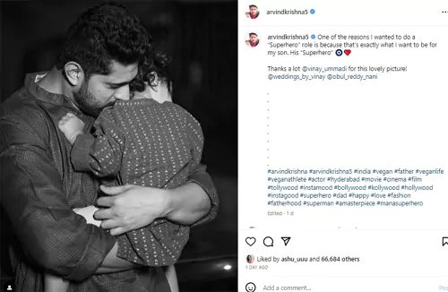 అరవింద్ కృష్ణ నటిస్తున్న లేటెస్ట్ మూవీ "ఏ మాస్టర్ పీస్". ఇదివరకెన్నడూ చూడని కొత్త తెలుగు సూపర్ హిరోగా అరవింద్ కృష్ణ ఆడియన్స్ ముందుకొస్తున్నాడు. ఇతనికి జతగా అష్షు కనిపిస్తోంది. అరవింద్ కృష్ణ యాక్టర్ మాత్రమే కాదు బాస్కెట్ బాల్ ప్లేయర్ కూడా. ఇతను తన అప్ డేట్స్ ని అలాగే తన బిడ్డ అద్వైత్ తో ఎంజాయ్ చేసే టైంని వీడియోస్ తీసి తన ఫాన్స్ కోసం ఇన్స్టాగ్రామ్ లో పోస్ట్ చేస్తూ ఉంటాడు. ఇప్పుడు తన బిడ్డను ఎత్తుకున్న ఒక ఫోటో పెట్టి "నేను సూపర్హీరో పాత్రను చేయాలనుకోవడానికి ఒక కారణం ఉంది అది ఏమిటంటే, నా కొడుకు దగ్గర అలా ఉండాలి అనుకుంటున్నా అందుకే ఈ రోల్ చేసాను. నేను అతని సూపర్ హీరోని" అని కామెంట్ పెట్టాడు. ఇక ఈ పిక్ ని చూసిన నెటిజన్స్ "సూపర్ డాడీ, క్యూట్ పిక్, నైస్ క్లిక్, గాడ్ బ్లెస్స్ యు బోత్, క్యూట్ నెస్ ఓవర్ లోడెడ్, అల్ ది బెస్ట్" అని కామెంట్స్ చేస్తున్నారు.