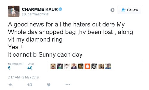 అవకాశాలు లేకపోయినా, సొంత నిర్మాణ సంస్థ స్థాపించి ఎలాగో మళ్లీ హిట్ కొట్టాలని ట్రై చేస్తోంది ఛార్మి. జ్యోతిలక్ష్మి తర్వాత ఛార్మి మళ్లీ జనాలకు పెద్దగా కనిపించలేదు. మనసులో ఏం ఉన్నా ఓపెన్ గా ఎక్స్ ప్రెస్ చేసే ఈ భామ వ్యక్తిత్వం అభిమానులతో పాటు శత్రువుల్ని కూడా తెచ్చిపెట్టింది. అందుకే ఛార్మిని ట్విట్టర్లో ఇబ్బంది పెట్టే వాళ్లు కూడా ఎక్కుగానే ఉంటారు. ఇప్పుడు వాళ్లందరికీ ఒక షాకింగ్ పంచ్ వేసింది ఛార్మి. తనను ద్వేషించే వాళ్లందరికీ ఒక గుడ్ న్యూస్ చెబుతానంటూ, తన షాపింగ్ బ్యాగ్ తో పాటు, డైమండ్ రింగ్ ను కూడా కోల్పోయానని చెబుతూ, ప్రతీరోజూ మంచి రోజు కాదు కదా అంటూ నిట్టూర్చింది.