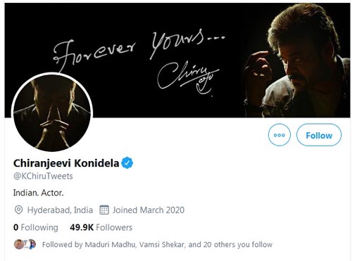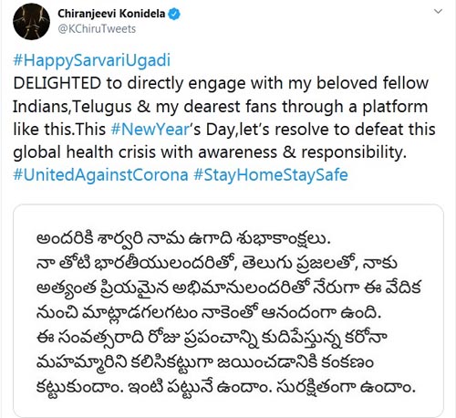 మెగాస్టార్ చిరంజీవి సోషల్ మీడియాలో అడుగుపెట్టారు. ఉగాది పర్వదినం సందర్భంగా కె చిరు ట్వీట్స్ పేరుతో ట్విట్టర్ అకౌంట్ను బుధవారం ప్రారంభించారు. ఉదయం 11:10 గంటలకు చేసిన తొలి పోస్ట్లో ప్రజలకు ఉగాది శుభాకాంక్షలు తెలిపారు. తోటి భారతీయులతో, తెలుగు ప్రజలతో, అభిమానులతో ఈ వేదిక నుంచి మాట్లాడగలగడం తనకెంతో ఆనందంగా ఉందన్నారు. కరోనా మహమ్మారిని కలిసికట్టుగా జయించడానికి కంకణం కట్టుకుందామని పిలుపునిచ్చారు.